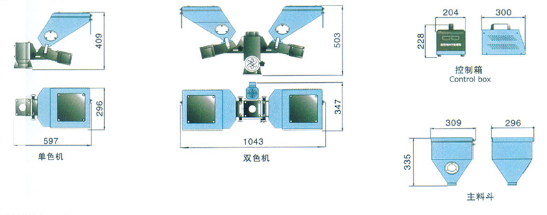 備注:1."*"表示螺桿直徑依客戶選型而定,"**"表示依客戶所選螺桿決定輸出量大小,可參考單色機的量。例如NCVD-D-12/14,輸出量即為0.21-60kg/hr; 2.加裝攪拌器,機型后面加注MX; 3.以上機型輸出能力是以比重為1.2、直徑為2-3的色母顆粒料以連續運轉方式測試標準所得的數據; 4.此機器須與成型機料斗爸成90度方向安裝,以防止因散熱不良而影響馬達功能。