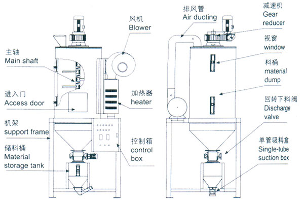 該系列結晶系統可將非結晶PET轉變成結晶狀來進行干燥,在高溫下干燥以得到低水分原料而不擔心結塊。 它由一個高溫熱源,一個帶攪拌器的絕熱料斗和一個螺旋卸料閥組成,并可靈活的與其他原料處理設備搭配使用。