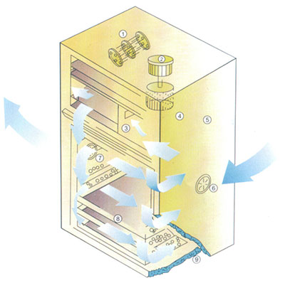 箱型干燥機(jī)中,有可移動的盤子,可將要烘干 的原料放在盤子內(nèi),運(yùn)行時風(fēng)車迫使空氣通過 發(fā)熱絲,再通過均風(fēng)板均勻吹進(jìn)原料,當(dāng)原料 均勻烘干后,超時的空氣由另一面排風(fēng)口排出。 |