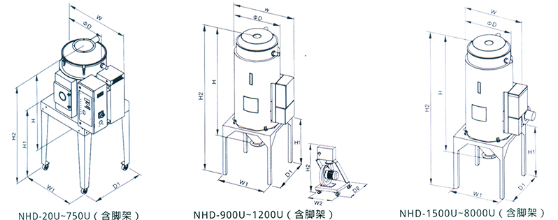 NHD-U系列下吹式歐化料斗干燥機料斗采用不銹鋼制造,配備有“熱氣下吹”及“旋風排氣”功能及雙層保溫桶,特別 適合搭配除濕機用來干燥工程塑料。該系列能提供的裝料容量由20至8000公升,共分為25種機型。該產品除了與原料接觸的 零件以外,連與熱風產生接觸的部分也都采用不銹鋼制造,配備有保溫式的清潔門,同時全系列配備全數字微電腦控制,并 提供定時開關機的功能。
