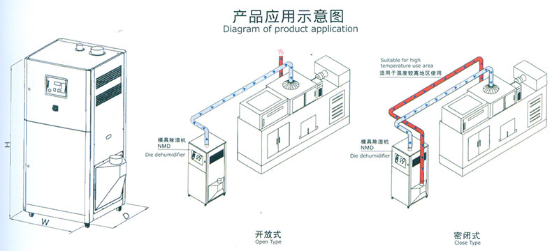 NMD模具除濕機主要應用在塑膠成型中,由于模具使用冷凍水來縮短成型周期而產生的結露問題,特別是PET瓶胚射出 為適用。結露現象是當模具表面溫度低于周圍環境空氣的露點溫度時就會產生水氣,進而影響到產品質量及生產效率,同 時會腐蝕模具表面,造成環境污染,本機采用蜂巢轉輪系統進行除濕作業,確保模具周圍始終維持在0到-10的低露點空氣環 境,不讓模具產生結露現象也不受季節變化的影響,大幅降低不良率。