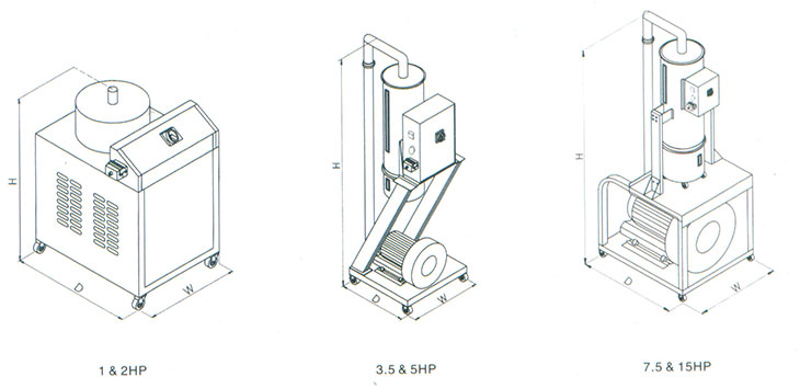 備注:1."NVH"表示電眼料斗;"NMH"表示真空料斗。 2.輸送能力測(cè)試條件為:輸送高度4m、輸送距離1m。 3.機(jī)器電壓規(guī)格為3φ, 380V,50Hz。 4.3.5HP以上機(jī)型附破真空閥。